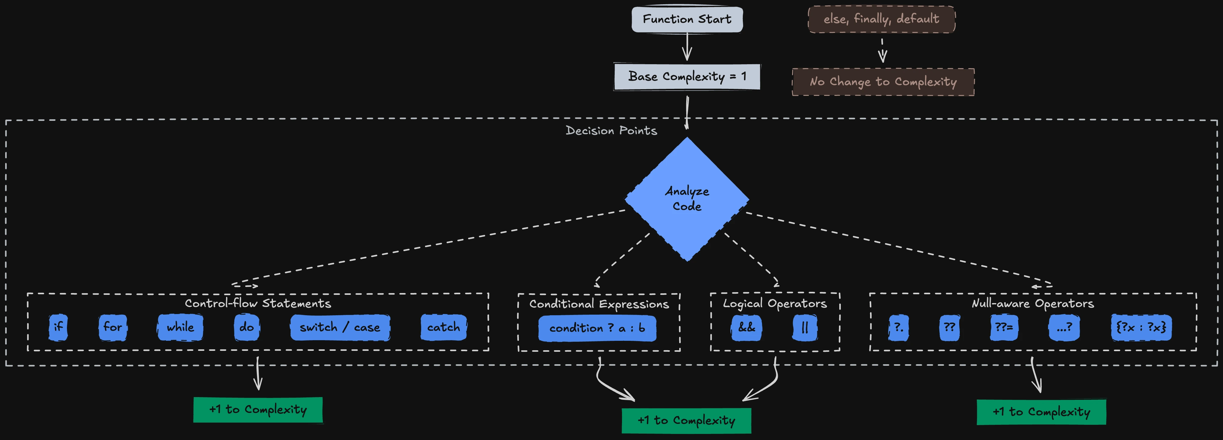 Note that else, finally, and default or last case don't add to the count — they're the fallback path, not a new decision.