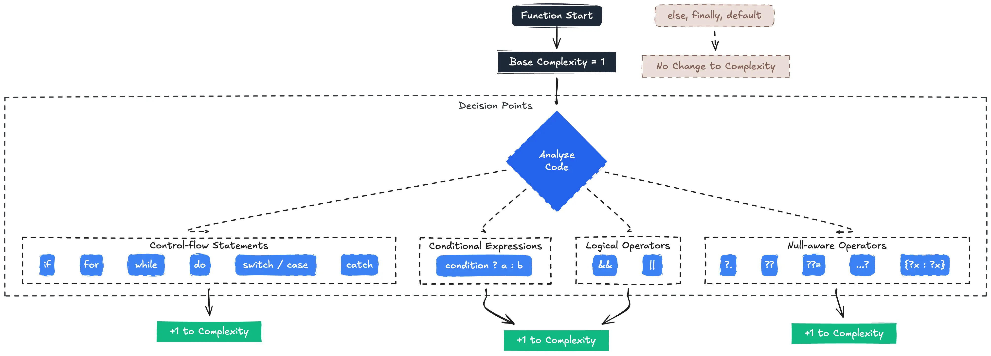 Note that else, finally, and default or last case don't add to the count — they're the fallback path, not a new decision.